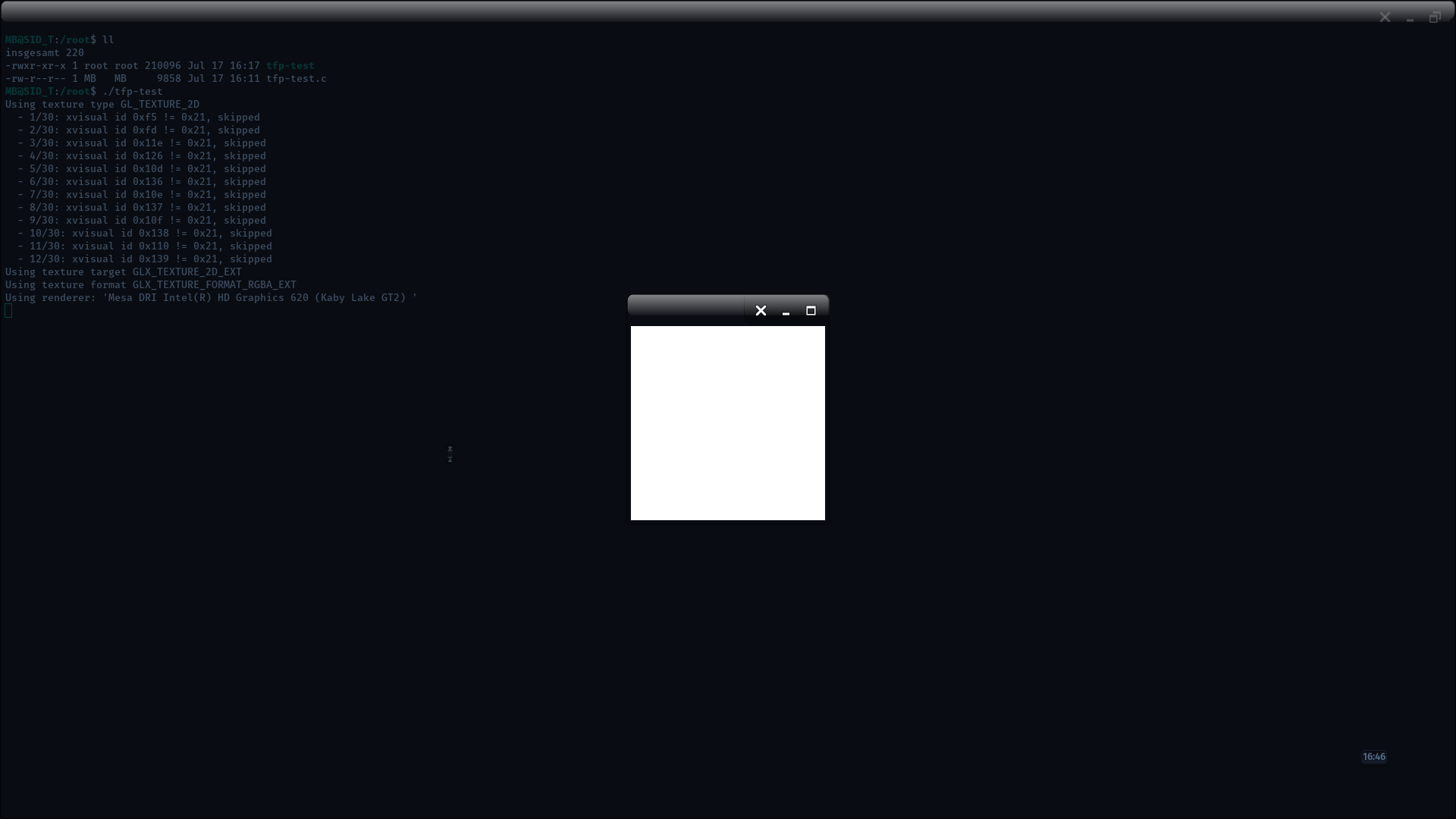 What gives: $ MESA_DEBUG=1 MESA_INFO=1 ./tfp-test on your system?