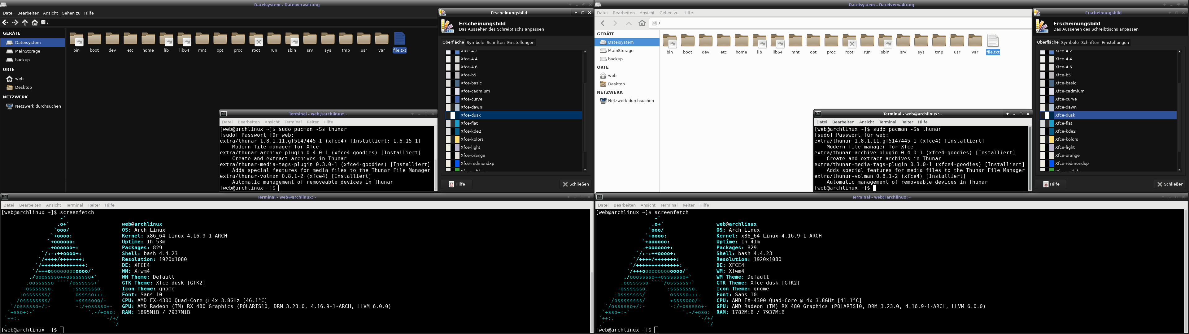 Created attachment 7825 Before (left) and after (right) upgrading. When using Thunar 1.8.1.11 and selecting any Xfce* gtk2 theme, Thunar does neither change its background nor the select color. The title bar changes though. Reproduction: 1. Open Appearance from the settings menu 2. Choose any style in the form of Xfce* (e.g. Xfce-dusk). 3. Open Thunar. Expected result: Thunar's background is black (when choosing Xfce-dusk. May vary when choosing other themes). Actual result: Thunar's background is white (no matter which theme you choose). It looks like the Adwaita theme. I have appended two screenshots which also show the output of screenfetch and the installed versions of Thunar. My display manager is lightdm. OS: Arch Linux Kernel: 4.16.9-1-ARCH Working Thunar version: 1.6.15-1 Non-working Thunar version: 1.8.1.11.gf5147445-1 Only difference is the version of Thunar. Downloaded and installed using pacman. If you happen to have further questions, I'd be glad to answer them.