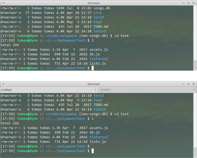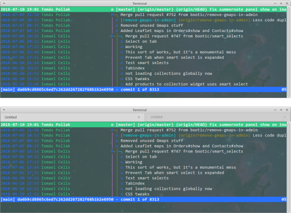Hi, I'm running xfce4-terminal version 0.8.7.3 and for some reason an extra line is added to the terminal window whenever tabs are shown. I'm attaching an image shown tig's output with and without an extra tab open. It looks like xfce4-terminal isn't reporting its height correctly. I'm running 4.12.4 (revision 7844952) on x64 Ubuntu 18.04 LTS, by the way. Thanks!