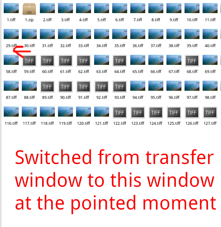 Yeah, thanks! Additions: 1. Not all moved files are selected in the destination folder and have a normal thumbnail: attached a screenshot (1.png). 2. I see a similar issue after extracting of an archive (2.png). Broken icons exist when both a & b: a) after I have switched from transfer window to folder window; b) before I scrolled the latter or switched to some another window (i.e. folder window's view updated). 3. One time I saw one more issue (maybe, similar): on external NTFS partition, just at folder viewing, a subfolder treated as a regular file. So it had o text-or-unknown-file icon and was listed after all folders (3.png, but it's a reconstruction). Refreshing the folder helped. Thanks!