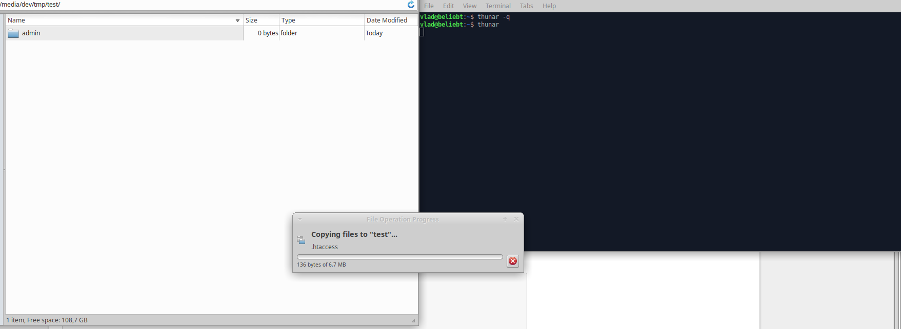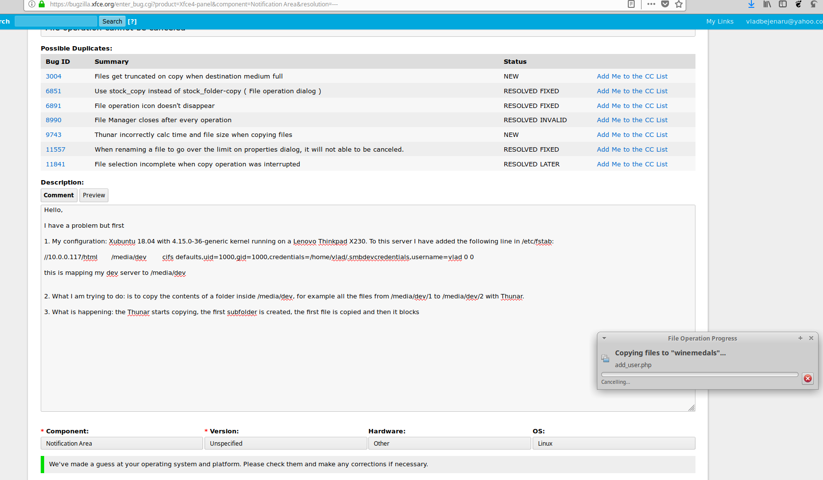 Created attachment 8040 blocked File operation progress dialog box Hello, I have a problem but first 1. My configuration: Xubuntu 18.04 with 4.15.0-36-generic kernel running on a Lenovo Thinkpad X230. To this server I have added the following line in /etc/fstab: //10.0.0.117/html /media/dev cifs defaults,uid=1000,gid=1000,credentials=/home/vlad/.smbdevcredentials,username=vlad 0 0 this is mapping my dev server to /media/dev 2. What I am trying to do: is to copy the contents of a folder inside /media/dev, for example all the files from /media/dev/1/ to /media/dev/2/ with Thunar. 3. What is happening: the Thunar starts copying, the first subfolder is created, the first file is copied and then it blocks. The "File Operation Progres" does not move. If I press the close button it minimizes to tray and stays there. If I am pressing the cancel button, nothing is happening. I have made also a screenshot p.s. I do not know if this should be filed under Thunar or under Panel.... sorry :-)