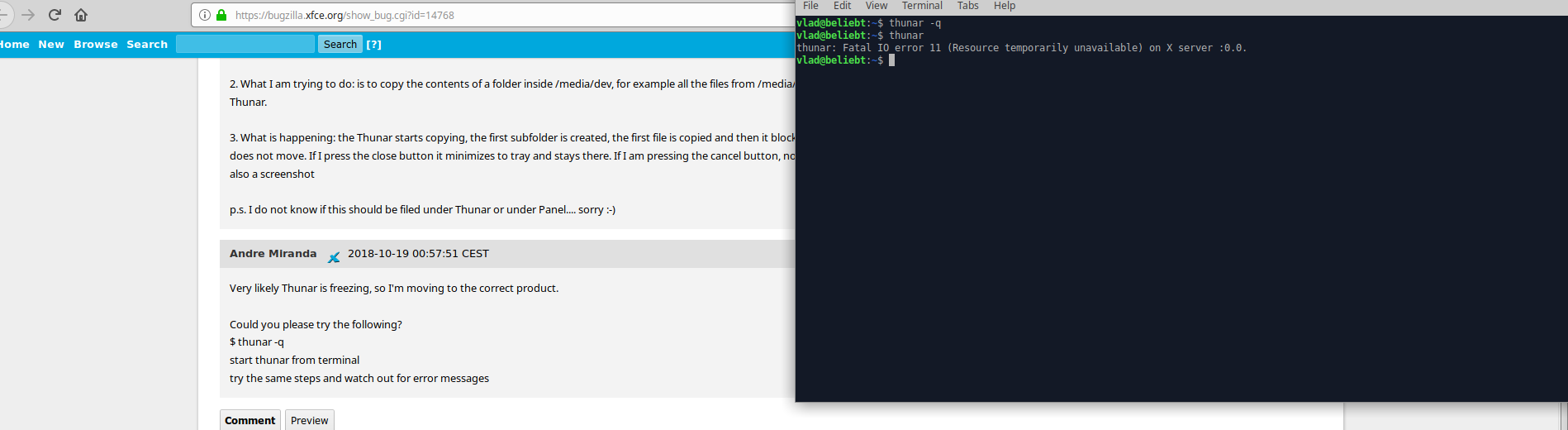 Hi! Thanks for correcting the category. I have done the steps. Thunar does not verbose anything... it just freezes... I can close the Thunar window with no error message. If I kill the file progress window with xkill than I receive the following message in terminal: thunar: Fatal IO error 11 (Resource temporarily unavailable) on X server :0.0. Print-screens attached.
