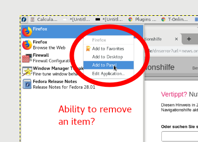 Created attachment 8070 Screenshot where delete could be integrated Dear all, What do you think of a feature to delete entries directly from Whisker Menu? This would be helpful for people who have many orphan entries there (like me :-) ) Attaching a screenshot. Thank you! Yours, Robert