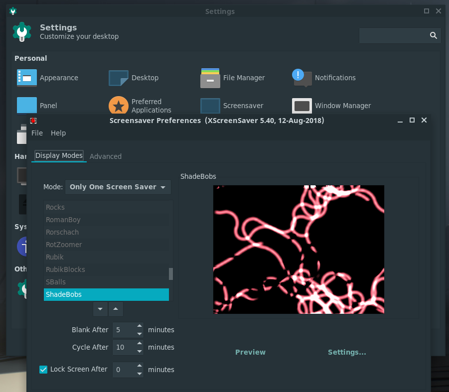 Created attachment 8249 Result of clicking on 'Screensaver' entry in 'Settings': new xscreensaver settings window is opened Really sorry for the trouble, but… I’ve compiled & installed xfce4-screensaver 0.1.3 (with dependencies) successfully from git, on Xfce 4.1.2 in Debian testing as indicated here: https://docs.xfce.org/apps/screensaver/installation But something is clearly not right: xfconf has no ‘xfce-screensaver’ category, and while there is a ‘Screensaver’ option in Xfce’s ‘Settings’ GUI, all that does is launch a separate window for xcsreensaver’s settings… When the screensaver runs and I go to unlock, I get xscreensaver’s homely unlock dialog – not xfce4-screensaver’s lightdm-themed unlock dialog. So somehow, I’m missing practically all of the xfce4-screensaver goodness, it’s as if I only installed xscreensaver. :/ (I never had xcscreensaver installed before, only added it as a dependency of xfce4-screensaver). Light-locker is not running (disabled from autostart-ing), and I’ve updated the xflock4 script.