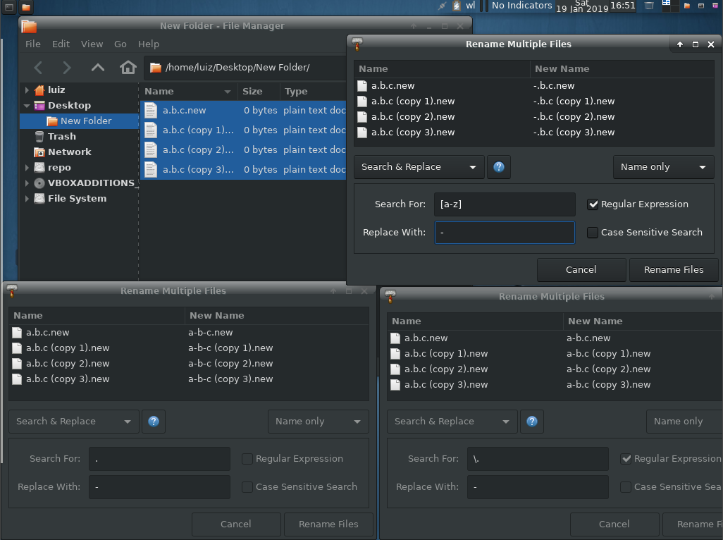 Created attachment 8253 Example of various bulk renamings Bulk renamer replaces *all occurrences* of a non REGEX expression (or a simple pattern), which is the correct behavior. However, if a REGEX is given, it replaces only *the first occurrence*. I've tested with thunar vs1.6.10 (Ubuntu 14.04) and with vs 1.8.2 (Archlinux 4.20.0).