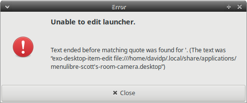 I have a menu item with a single quote in its title created via MenuLibre - if I right-click it on the Whisker menu and choose "Edit Application..." I get an error - > Text ended before matching quote was found for '. (The text was "exo-desktop-item-edit file:///home/davidp/.local/share/applications/menulibre-scott's-room-camera.desktop") Screenshot of the error dialog attached.