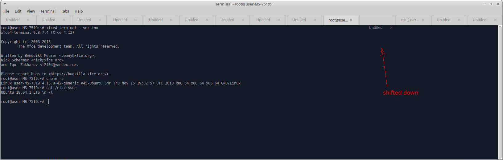 Created attachment 8270 screenshot with tab title shifted down See screenshot. Don't know how to reproduce. Xfce4-terminal process with this glitch is still running, maybe somebody can attach to it using GDB and find out, why this happened. Or maybe need some core dump
