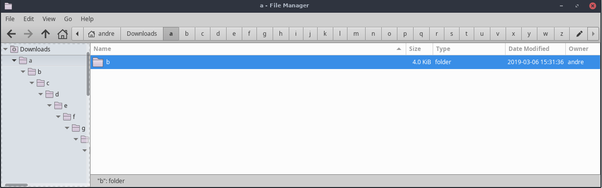 Created attachment 8324 thunar-tree-view.gif I can't reproduce with 1.8.4, see the attached gif. Am I missing something? Commands to create the folders and open the last one: mkdir -p a/b/c/d/e/f/g/h/i/j/k/l/m/n/o/p/q/r/s/t/u/v/x/y/w/z thunar a/b/c/d/e/f/g/h/i/j/k/l/m/n/o/p/q/r/s/t/u/v/x/y/w/z
