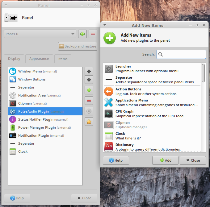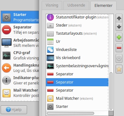 Created attachment 8484 Red bars and gears If i go to panel settings/preferences under Items tab the button to remove an element looks like a red bar. This is also how the seperator look in the list. But if you click the add button the seperator icon in the list in new dialog looks like a stop sign. I suggest having the same icon for seperator in both lists and not have it look the same as the remove button icon. I guess the same could be said for the edit button and the starter icon in the list. They both look like a gear