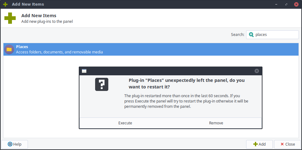Created attachment 8560 Screenshot of the error As soon as I try to add the places plugin to the panel, I get an error message saying "Plug-in Places unexpectedly left the panel, do you want to restart it?". No matter what I do, it is not added and does not work. I am using version 1.8.0-0ubuntu1~19.04 from the staging PPA (https://launchpad.net/~xubuntu-dev/+archive/ubuntu/staging). The rest of the error message is in the screenshot.