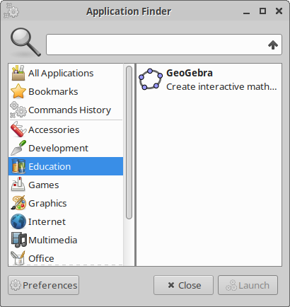 The Education category does not show in application finder. It shows in applications menu and whisker menu. So i suggest they all show the same. Either all show the menu or none of them show it. Version 4.13.2.
