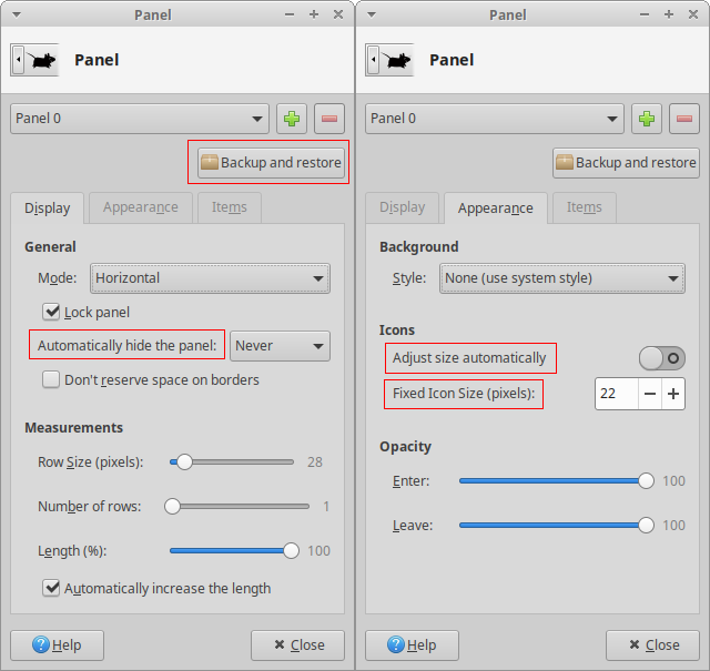 Created attachment 8699 screenshot with red highlighted areas Steps: 1. Open panel preferences dialog. 2. Press and hold the alt key to see the underlined letters 3. Notice that its missing on the 'Backup and restore' button and 1 label in the Display tab and 2 labels in the Appearance tab. Tested on Xubuntu 19.10 Daily