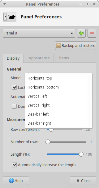 Created attachment 8756 mockup I would like to recommend the addition of three new entries into the mode drop down list in the display tab of the panel properties dialog. The three new entries are 'Horizontal bottom', 'Vertical right' and 'Deskbar right'. In addition to these three new entries, the existing entries would be changed to 'Horizontal top', 'Vertical left' and 'Deskbar left'. The reason for this is to simply the movement of the panel to the opposite side of the screen, which presently requires the panel to first be unlocked and then manually moved. A video explaining this suggestion can be seen here - https://www.youtube.com/watch?v=VF-XHI6_37A&t=92s