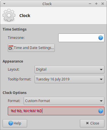 Created attachment 8783 screenshot with red error highlight of field Steps: 1. right-click on Clock in panel 2. click Properties in context menu 3. under Clock Options, select 'Custom Format' in Format drop down list 4. enter in %D into the text field In panel 4.12.2 (Xubuntu 18.04) and 4.13.6 (Xubuntu 19.10), the entire text of the Clock with disappear. In 4.13.6, the text field will also turn red to indicate an error, though the documentation clearly states that %D is for "date; same as %m/%d/%y". http://docs.xfce.org/help.php?version=4.12&locale=en_US&component=xfce4-panel&page=clock