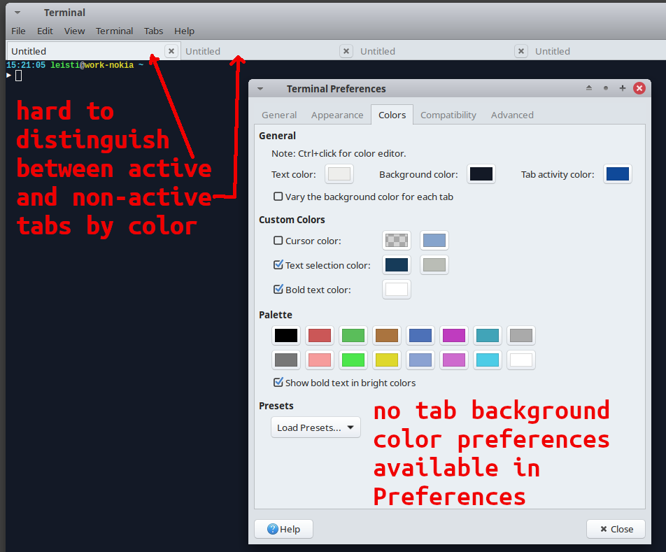 Created attachment 8814 screenshot of Terminal with more than one tab, and the "Colors" tab of the preferences dialog It is currently very hard to distinguish the active tab from inactive ones, as the background colors of both types of tabs are greys that are quite close to one another. The "Colors" tab of the "Terminal Preferences" dialog does not include options to change either color. (See the attached screenshot.) My request is that such options be added to the dialog.