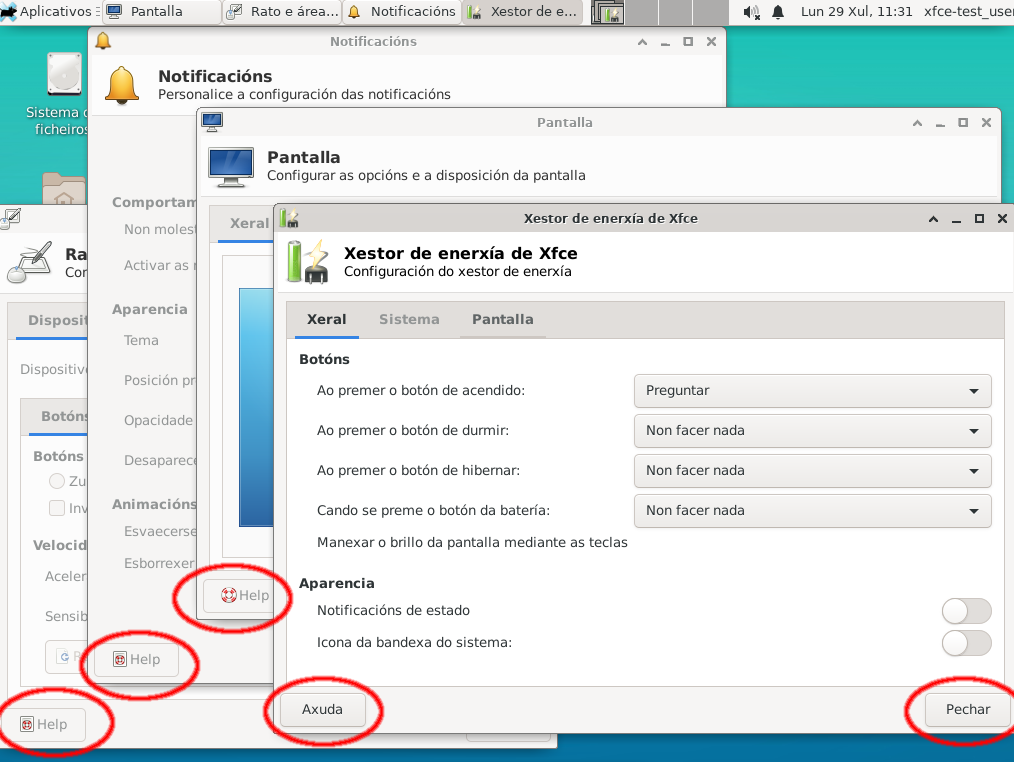 I have updated settings and panel: https://git.xfce.org/xfce/xfce4-settings/commit/?id=7b202a1 https://git.xfce.org/xfce/xfce4-panel/commit/?id=ae8e7bb xfce4-notifyd-config and xfce4-mouse-settings are fully translated here, maybe xfce-test is not completely updated. Dani, if you find more strings not translatable please e-mail me. Thanks for reporting.