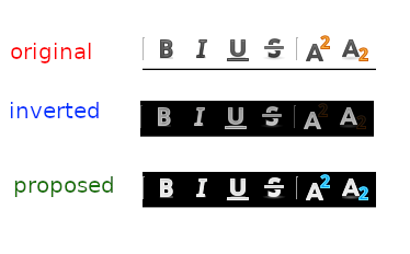 Created attachment 8882 comparison original / inverted / proposed special inversion Here you see some of the buttons from LO Writer, which can stay in the pressed state. The easiest thing would be the inversion, shown in the second line. However, some small details are not high contrast. Therefore my proposal of the third line: a special inversion. I show the inversion curve made with GIMP in my next comment's attachment.