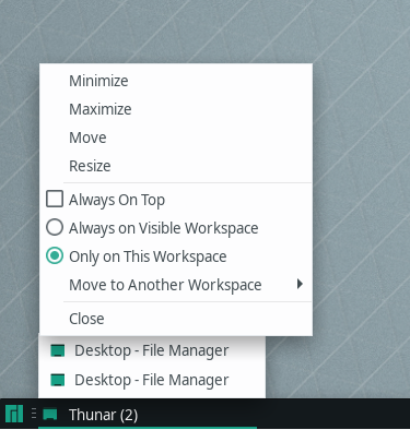 Created attachment 8909 correct behavior on xfce 4.12 With XFCE 4.12 it was possible to right click a single item for a grouped window. How to reproduce? - Enable window grouping (panel-preferences > items > edit window buttons > window grouping: always) - open thunar (or any other program) 2 times - left click the stack inside the panel - a pop up opens showing the two thunar instances - right click one of them actual behavior: right click is same as left click expected behavior: another context menu opens e.g. for closing this instance version: 4.14-Arch See the attached screenshot for the correct behavior on xfce 4.12