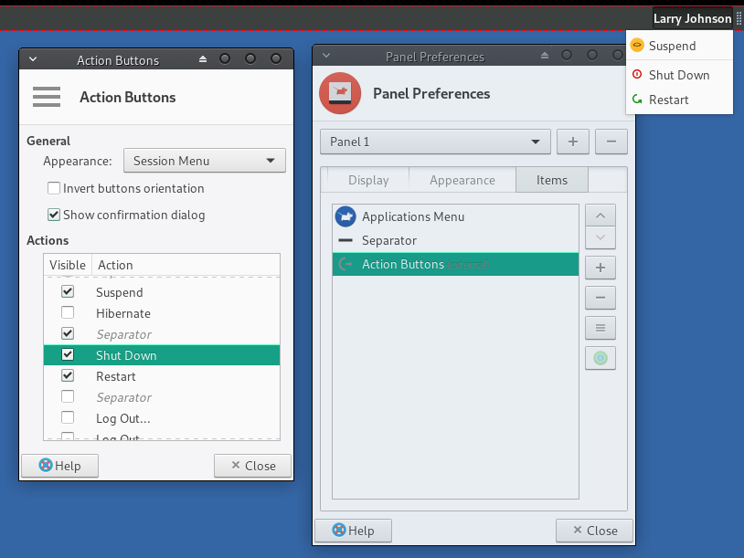 Created attachment 8911 Action button on panel Selecting 'Shutdown' from action button drop-down performs nothing, not even an error message. Shutdown accomplished by opening terminal and direct command.