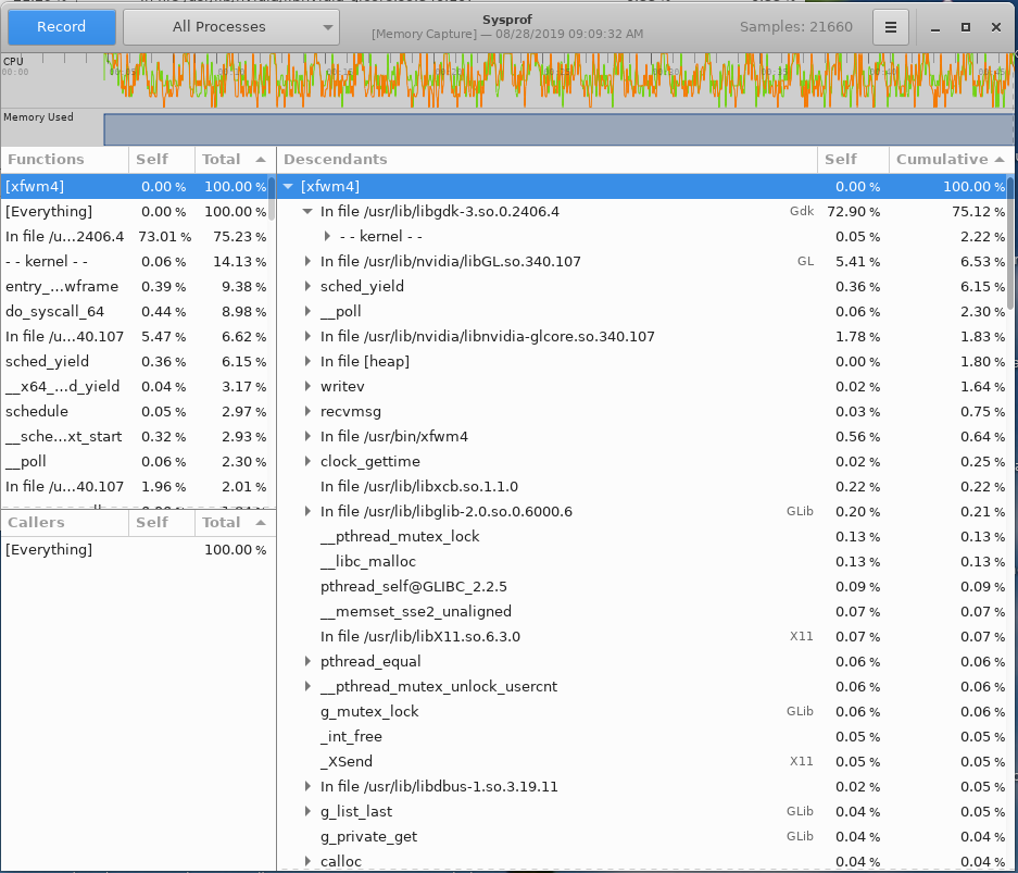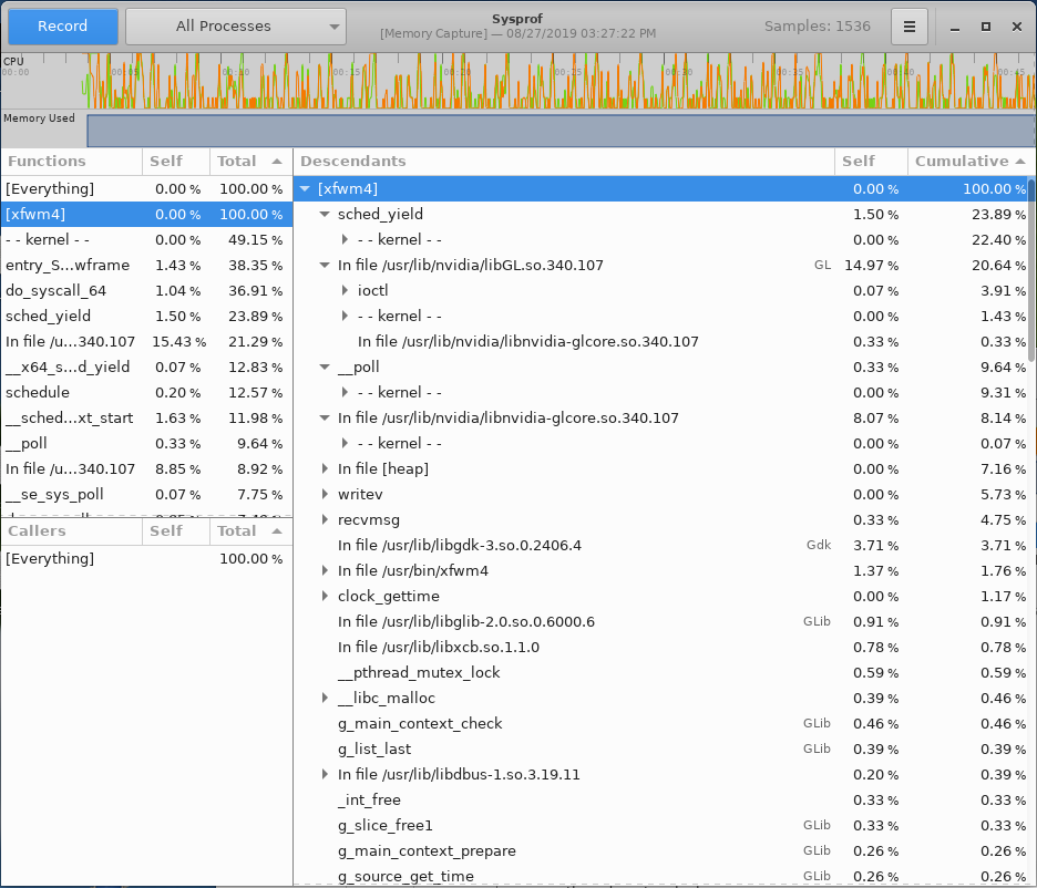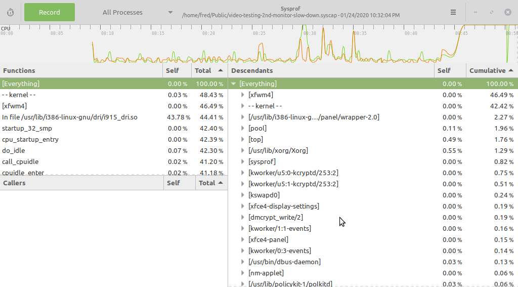 I'm back. I have a sysprof capture file for you, and I'll upload it now. The top lines in teh "functions" side of the sysprof window are: "Everything", 100% in the "total column" (all these numbers are from the "total" column, not the "self" column. Below that, "--kernel--" is at 48.3%, "[xfwm4]" is at 46.49%, and "in file /usr/lib/i386-linux-g nu/dri/i915_dri.so" is at 44.41%, with "43.78%" in the "self" column on that one. So it looks like the dri for the i915 driver is heavily involved here as well. For the capture, I had it just idling, doing nothing for the first 30 seconds or so. At that point, I plugged in the second monitor and the CPU load went up significantly and the thing got very sluggish. The "clock" on the sysprof window was only updating every 6 to 10 seconds. At about 3:30, I unplugged the monitor, and I stopped the capture after 5 minutes. I'll try to figure out how to use the modesetting driver and get back with those results later tonight or maybe tomorrow night.