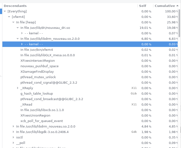 I use "GeForce 8600M GT" VGA controller with "NVIDIA drivers, 340xx legacy branch (340.107)". It is laptop. There are no info about current vsync method in the driver settings. So I think it is "none". Only in OpenGL tab there is checked "Sync to VBlank" option. I checked with sysprof where it spends its cycles in normal condition (screenshot 1) and when that happen (screenshot 2). It is in file /usr/lib/libgdk-3.so.0.2406.4 (I use latest xorg-server 1.20.5-2 and latest linux 5.2.9)