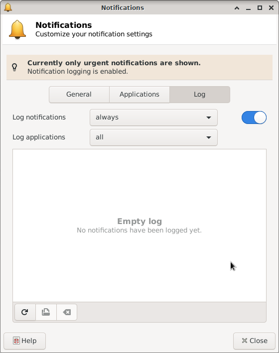 Created attachment 9015 "Empty log" issue Hello, The window doesn't show any notification on the log list view, despite having enabled the 'Log notifications' setting.