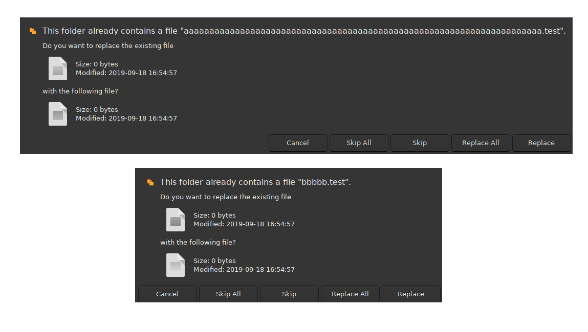 Created attachment 9036 thunar conflict dialog windows are not aligned When copying / moving multiple files with variable filename lengths, whenever a duplicate conflict arises, the dialog popup window is resized to accommodate the filename's length. The problem is two folds: * The action button widget moves around (it is right-justified, thus sticks to the right corner of the window) * The window geometry changes if the filename's length is long and wouldn't fit in the window It is then very easy to miss the "skip" button and click the "replace all" button instead, which leads to potential data loss! A simple fix would be to make the action buttons centered. That way, even if the window gets resized, as long as it is centered by the window manager (which I assume is the case in most cases), the mouse cursor won't risk missing the appropriate action button by having to move around every time.