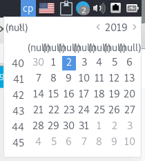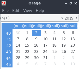 Created attachment 9072 Orage main window When LC_TIME is set to uk_UA.utf8 (for example), all the month and week day labels are shown as (null). BTW pop-up calendar from the clock panel plugin behaves the same way. Screenshot attached.