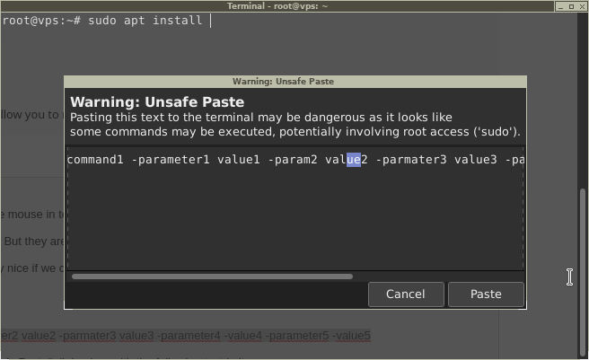 Hi, I know there are some limitations to use the mouse in terminal. I also know about some of those shortcuts. But they are not like switching the cursor to a specific point in the text. what I am suggesting here, it would be very nice if we can use a shortcut to open the "Unsafe Paste" dialog box and see the active commands and parameters in it. Let's say I am typing some command like: $ command1 -parameter1 value1 -parameter2 value2 -parmater3 value3 -parameter4 -value4 -parameter5 -value5 By using a shortcut, I want to see the "Unsafe Paste" dialog box with the following text in it: "command1 -parameter1 value1 -parameter2 value2 -parmater3 value3 -parameter4 -value4 -parameter5 -value5" After I editing the text in the dialog box I should be able to run it directly. I attached a screenshot for the dialog box I am tying to tell.