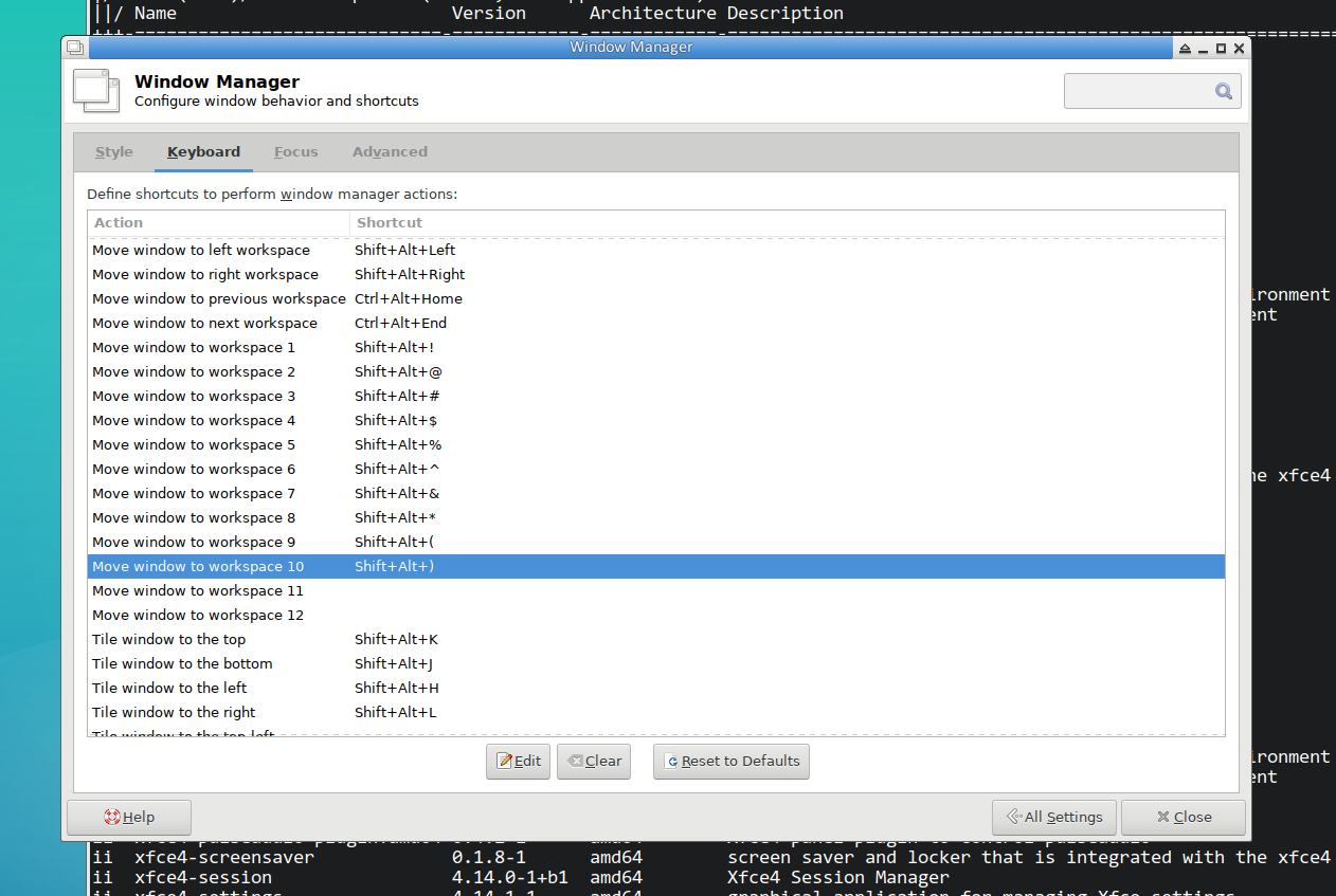 I have 10 workspaces. Moving windows to those workspaces is (key)binded with Alt+Shift+1 until Alt+Shift+0 (so, 2, 3, etc). This works just fine until workspace 8, after which switching to 9 or 0 (10) no longer works. I've replaced Alt+Shift+9 with Alt+Shift+> and it works. If the window is a xterm/urxvt I see that the key is interpreted by the X terminal. my xfce version from debian testing: dpkg -l \*xfce\* | grep ^ii ii libxfce4panel-2.0-4 4.14.1-1 amd64 Xfce4 panel library (GTK3 variant) ii libxfce4ui-1-0:amd64 4.14.1-1+b1 amd64 widget library for Xfce - Gtk+2 variant ii libxfce4ui-2-0:amd64 4.14.1-1+b1 amd64 widget library for Xfce - Gtk+3 variant ii libxfce4ui-common 4.14.1-1 all common files for libxfce4ui ii libxfce4ui-utils 4.14.1-1+b1 amd64 Utility files for libxfce4ui ii libxfce4util-common 4.14.0-1 all common files for libxfce4util ii libxfce4util7:amd64 4.14.0-1 amd64 Utility functions library for Xfce4 ii xfce4 4.14 all Meta-package for the Xfce Lightweight Desktop Environment ii xfce4-appfinder 4.14.0-1+b1 amd64 Application finder for the Xfce4 desktop environment ii xfce4-dict 0.8.3-1 amd64 Dictionary plugin for Xfce4 panel ii xfce4-panel 4.14.1-1 amd64 panel for Xfce4 desktop environment ii xfce4-pulseaudio-plugin:amd64 0.4.2-1 amd64 Xfce4 panel plugin to control pulseaudio ii xfce4-screensaver 0.1.8-1 amd64 screen saver and locker that is integrated with the xfce4 desktop ii xfce4-session 4.14.0-1+b1 amd64 Xfce4 Session Manager ii xfce4-settings 4.14.1-1 amd64 graphical application for managing Xfce settings ii xfce4-taskmanager 1.2.2-1 amd64 process manager for the Xfce4 Desktop Environment