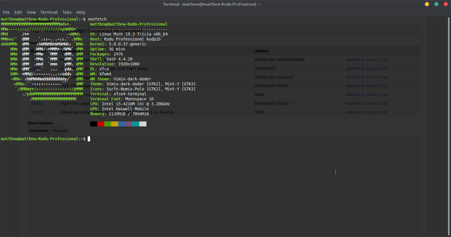Created attachment 9320 neofetch I generally use Linux Mint XFCE with the compton compositor. I decided to test the new 4.14 xfwm4 compositor instead of compton. My CPU usage for the same video went from 16% to 40%. Went back to compton due to increase. Attached is a neofetch of my hardware and system.