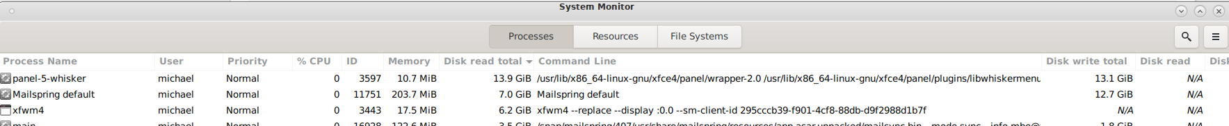 Created attachment 9358 Screenshot from my task manager This may not be a bug but I can't find any support forum that discusses this subject. I want to report what appears to me as a problem regarding disk i/o by the whisker menu plugin. As you can see in the attached screenshot, the whisker menu plugin has currently read and written nearly 14 gb of data on my disk so far. For a plugin that simply shows a menu of things for me to choose from, this just doesn't seem right. Especially the write numbers - why has the plugin written 14 gb of data to my disk? Does anyone have a clue why this could be happening? Is anyone else experiencing the same kind of problem? Again I'm not sure this is really a bug but it is a behaviour that gives me some cause for concern. If this truly reflects disk usage then it could adversely affect my SSD in the long run.