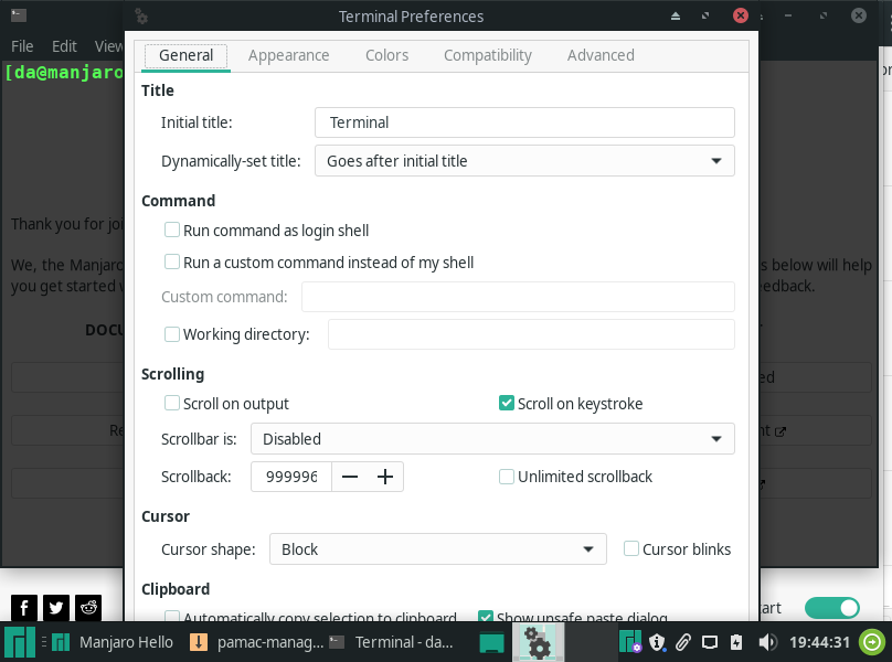 Created attachment 9666 xcfe-4 settings get out of screen Testing here Manjaro-xfce-19.0.2 or Virtualbox, default resolution is 808x800. When running "ps aux" or going to preferences content gets out of screen and can't scroll or see Accept/Exit, only hitting ESC works. By the way it happens with other applications too.