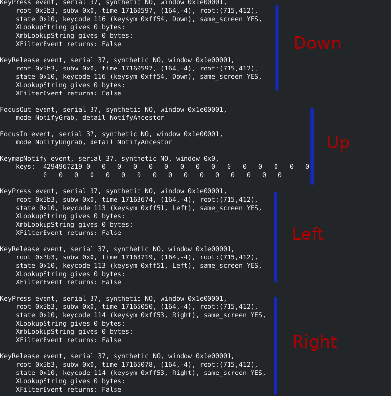 Created attachment 9866 Key pressed overserved by xev When running the xev command, I pressed Down, Up, Left, Right arrow-keys. Looks like the up key isn't connect to a key event (nor press nor release), instead I see FocusOut and FocusIn with KeymapNotify events?