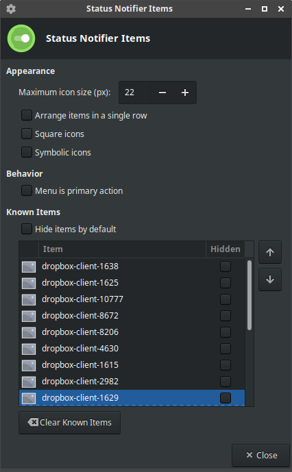 Created attachment 9902 New Item created at startup Impossible to hide Dropbox icon from Status Notifier Plugin. A new item is created every time the system is booted. It should be only one item. This way the user could select it for hiding once and it wouldn't be displayed ever again, unless user enables it again in the panel options.