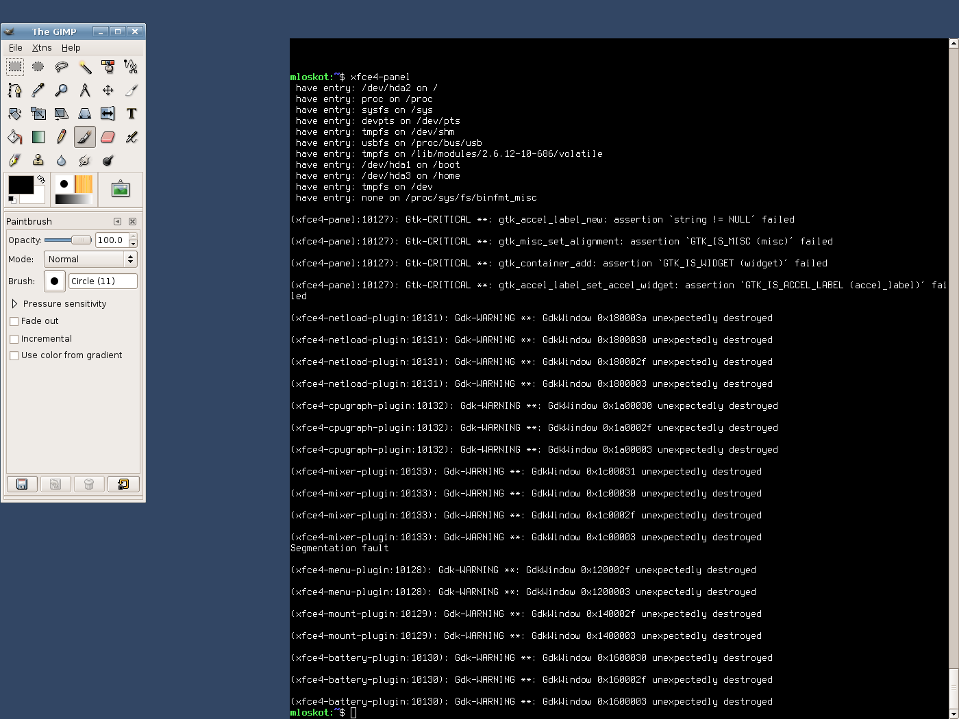 Created attachment 573 Screenshot #2 Screenshot with errors output from Xfce Panel after it crashed when I tried to open icon Properties dialog box (see "Steps to Reproduce" in the report description)