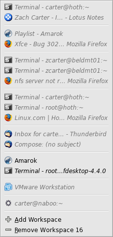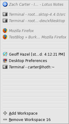 Ok, I see a few possible ways to go here. 1. I'm not really fond of adding a preference to switch between a 'normal' and 'compact' window list style, but I'm not really too strongly against it either, so that's one way to go. 2. Come up with a usable compromise between the current window list and the one you've worked up that we can all be happy with, and that will become the one and only window list. 3. Not totally related, but I also thought about doing submenus - one submenu per workspace. Might slow down workflow too much to be useful. Also the option of 'grouping' windows from the same application into submenus. Again, might be too slow. BTW, can you attach a screenshot of what your implementation looks like?