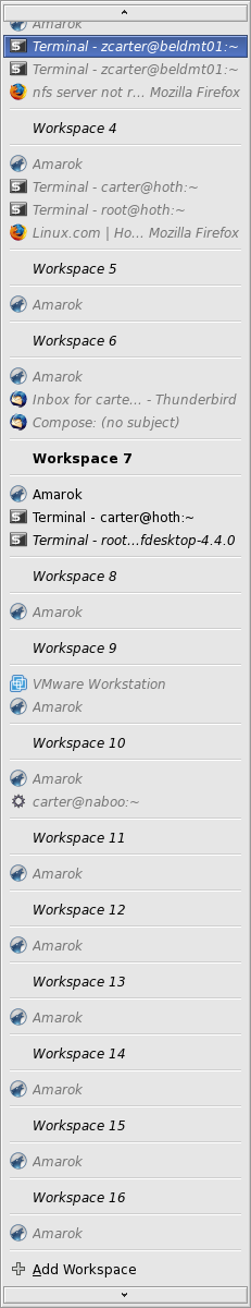 User-Agent: Mozilla/5.0 (X11; U; Linux i686; en-US; rv:1.8.1) Gecko/20061010 Firefox/2.0 Build Identifier: I am a heavy multitasker, with lots of workspaces, and lots of windows open, many of them sticky. All this means I end up with a *huge* windowlist. I've made a couple of modifications to the xfdesktop windowlist.c code to make it a little more compact. Basically, I changed three things: it only prints sticky windows once (for the active workspace), it strips out the code that prints the workspace names, and it ignores empty workspaces. Does this arrangement appeal to anyone else? Enough to make it into a "compact windowlist" setting everyone can use? Is there a better way to achieve a streamlined windowlist? Reproducible: Always See attached patches, built against xfdesktop-4.4.0