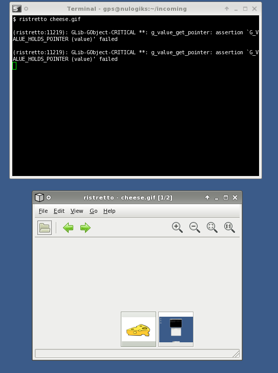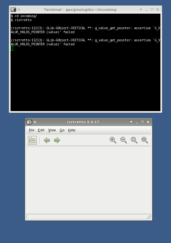 opening ristretto either by itself or with an image causes the following error to be displayed: (ristretto:11001): GLib-GObject-CRITICAL **: g_value_get_pointer: assertion `G_VALUE_HOLDS_POINTER (value)' failed
