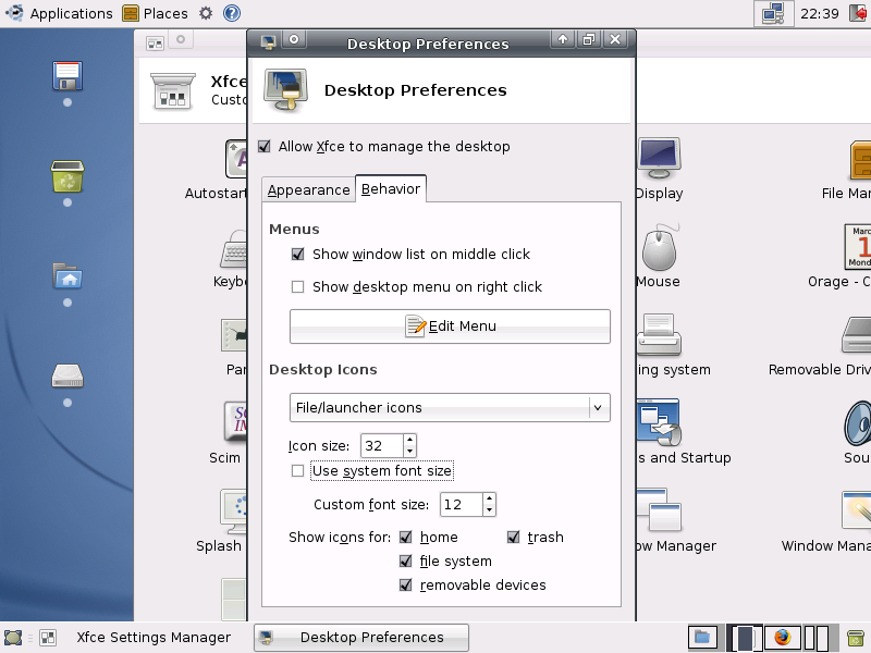 User-Agent: Mozilla/5.0 (X11; U; Linux i686; en-US; rv:1.9b4) Gecko/2008031317 Firefox/3.0b4 Build Identifier: (An ubuntu user reported this bug at: https://bugs.launchpad.net/ubuntu/+source/xfdesktop4/+bug/202970) Xfdesktop has a little cosmetic issue when switching from "system font size" to "custom font size" in the settings manager. 1) I expect, that when in Applications -> Settings -> Settings manager -> Desktop -> Behavior I uncheck the "Use system font size" option, xfdesktop will use the size given in the "Custom font size" spinbox. 2) Instead of that, when I uncheck it first, it will use a size of 0px for the desktop icons' font size, so the text is unreadable (I will attach a screenshot with the checked and the unchecked state). 3) How to reproduce the bug? This problem only happens, if the "Custom font size" option never changed, because if a change happens, the xfce-mcs-manager will store the value of the font size, and when unchecking the "Use system font size" checkbox, xfdesktop will load the stored setting. But if is no stored setting, xfdesktop will use the 0px. 4) Possible solution (#1) Make xfce-mcs-manager store the value of the spinbox, when the spinbox change its state from insensitive to sensitive. (I think think this is the better solution.) The first source file (behavior-settings.c), that I will attach, contains this solution. 5) Possible solution (#2) Modify xfdesktop, to use a more sensible default value, such as 12px. The second source file (xfce-desktop-settings.c), that I will attach contains this solution. Reproducible: Always