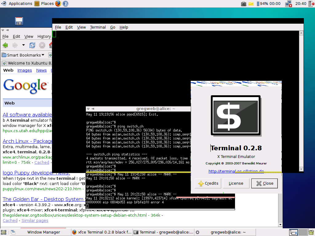 User-Agent: Mozilla/5.0 (X11; U; Linux i686; en-US; rv:1.9b5) Gecko/2008050509 Firefox/3.0b5 Build Identifier: Version: Terminal 0.2.8 (xubuntu specific?) This happened after a an dist-upgrade of xubuntu 7.10 to 8.04 which initially failed and had to resumed on the command line interface (dpkg . After the upgrade the xfce configuration was broken. I removed '.gnome*' and '.config' directories in my home directory. This fixed the xfce config problems but not the black window frames. I first suspected that the whole system is still broken. But currently it seems everything is ok (except the terminal window frame). Reproducible: Always Steps to Reproduce: 1. upgrade from xubuntu 7.10 to 8.04 2. Laptop (ev. X or xfce only) crashed 3. Restart of xfce --> black window frames 4. sudo aptitude dist-upgrade fixed brocken stuff caused by crash in step 2 --> black window frames remain 5. purged xfce config --> black window frames remain Expected Results: Window frame should not be black but according to 'Window Manager Style' choosen and show controls on the left and right and the title in the middle. The Terminals About Boxes Window frame is light green with black lines and dots in it. Additionaly red dots appear in the terminals window frame when you do the following: 1. open the About Box 2. move it such that it goes below the lower window frame of the terminal 3. click on the terminals window frame to activate it Sorry, hard to describe. If you are interested to see what I mean I may send you a PNG-screenshot. Please send me an e-mail in such case. Workaround: use xterm (==> severity: Minor)