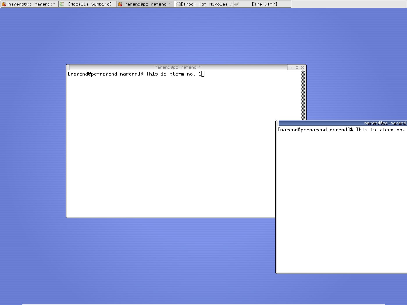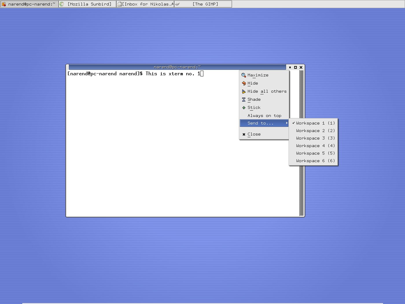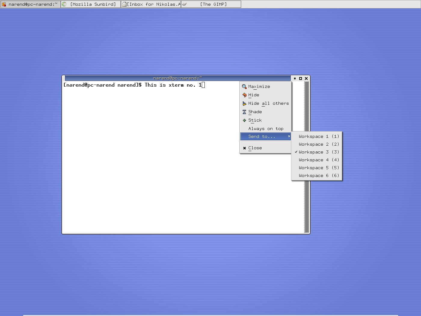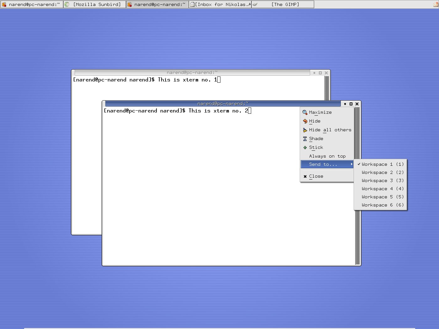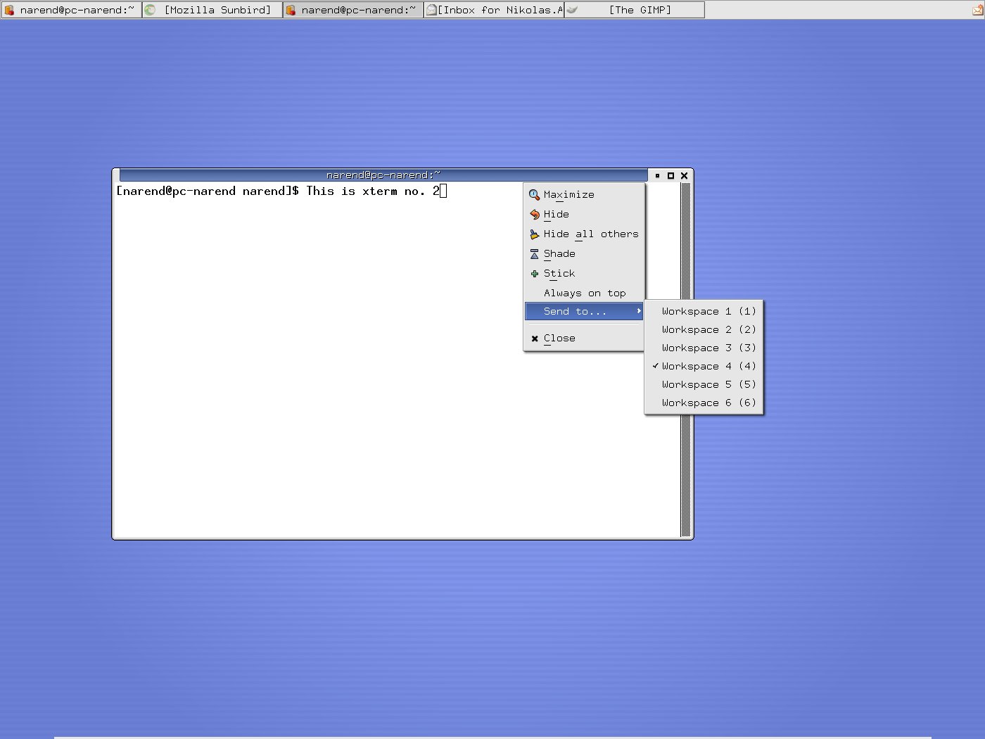 Hi Olivier, here follows the step by step description. To be sure, I've updated everything to todays CVS version. I should note that xfwm4 is compiled with the compositor enabled, but I don't have the Composite extension enabled in xorg. Here we go... My panel is set to autohide and oriented horizontally. The "Wrap workspaces when dragging ..." feature is activated. First I open an xterm on workspace 3, as shown in screenshot 1 by the titlebar->right click->Send to... menu. This xterm has an entry after the prompt saying "This is xterm no. 1". Next I drag it to the right corner. The workspace wraps and the xterm appears on a different one. I would expect, that this is either ws 4 or 2, depending on whether "drag right" means "wrap one ws forward" or "wrap one ws backwards". But as screenshot 2 shows, the xterm landed neither on ws 4 nor 2, but on ws 1. Let's try another xterm... I open it on ws 4 and label it "This is xterm no. 2" (see screenshot 3). Again I drag it to the right, the ws wraps and xterm 2 appears on a different ws. But, as shown in screenshot 4, this ws is not a neighbor of ws 4 (i.e. either 3 or 5), but again ws 1. So now I have my two xterms on ws 1. Screenshot 5 should just illustrate that neither xterm 1 nor xterm 2 can be dragged from ws 1 to any other ws. Assuming that xfwm4 puts them all to ws 1, that is not a big surprise. Hope I could make myself clearer than in previous mails. Regards, Nikolas.