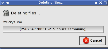 Sometimes, when a file deletion takes a long time, Thunar shows a progress window with a crazy amount of hours it estimates the deletion is going to take. Please see this image: http://img368.imageshack.us/img368/1202/thunarpt7.png I am using Thunar 0.9.0 on Debian Lenny AMD64.