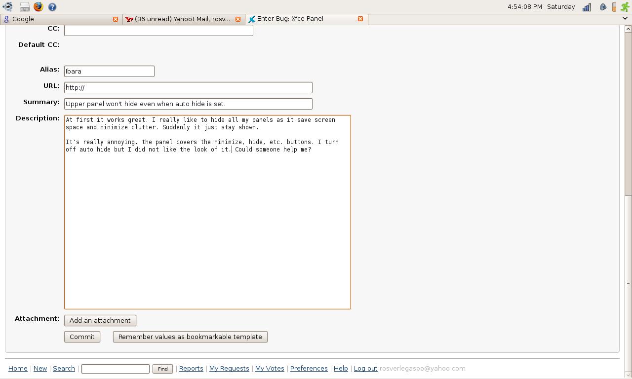 Created attachment 1799 Desktop screen shot At first it works great. I really like to hide all my panels as it save screen space and minimize clutter. Suddenly it just stay shown. I attached a screen shot. It's really annoying. the panel covers the minimize, hide, etc. buttons. I turn off auto hide but I did not like the look of it. Could someone help me?