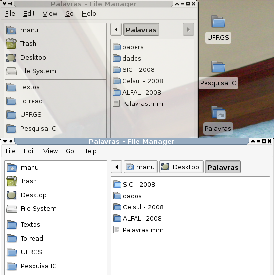 I've created a Desktop Link to a folder that contains some subfolders. When I open my folder through this Desktop Link, Thunar doesn't show a subfolder that was recently created there. This subfolder is the most recent one in the folder, but was created some days before the Desktop Link. This is not the first time something like this happens. By the way, I'm using Thunar 0.9.0 (couldn't find this option in the bug submission form) on Ubuntu Hardy. Attached, I'm sending a screenshot that shows the folder I'm talking about at the top, the Desktop Link on the right, and, at the bottom, the folder as opened by the Desktop Link.