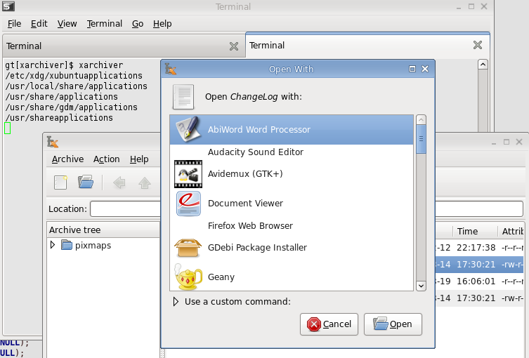 Created attachment 1984 correct path to applications .desktop files hi, Window displayed by selecting "open with" does not list applications installed on system. It's because xarchiver search in wrong desktop directories, there is a "/" missing in src/open-with-dlg.c at ligne 178.