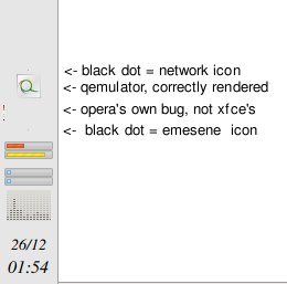 Created attachment 2050 picture showing the occurence of the bug You got to see the cropped screenshot i supplied below which sums up the issue MUCH better than words. the problem always strikes the same applications, and their icons always appear as dots, where unaffected applications have their icons rendered correctly at all times. shortly, there is no randomness involved. to make things worse, click and right click actions are also captured on a single pixel, BUT (you didn't see this coming), its not the black pixel, its roughly a few pixels to the upper left of the black pixel. This bug drove me real crazy when i switched my ISP, had connection problems and had to switch back and forth between two network settings. The Network Manager applet is one of the affected applications.. now picture me trying to find that right-click-pixel by trial and error over and over again. in the screenshot, you see Network Manager and Emesene (a msn messenger client) icons, or should i say you don't see them :) Note: the large empty space with a hint of a icon on left side is the opera icon, it's rendered incorrectly due to a widely known bug in opera's linux version, and totally unrelated to the issue i described here. thanks for your time and hopefully this will be my first step in helping out the xfce project:)