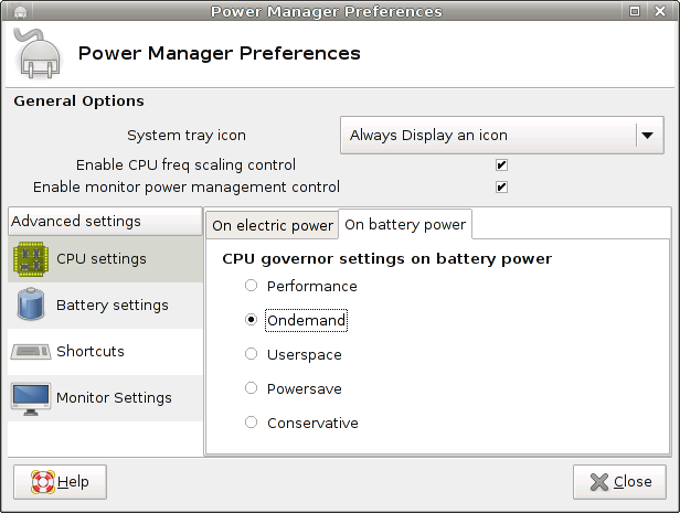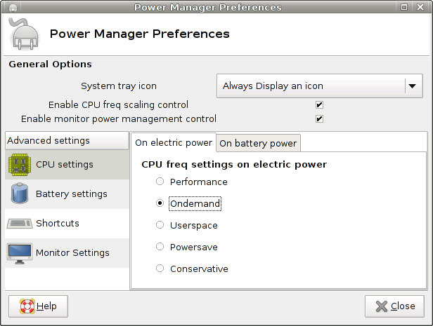 In preferences of Xfce4 power manager, under "CPU settings" you can change settings for the used cpu-freq governor on AC and on battery power. For AC it says "CPU freq settings on electric power", for battery "CPU governor settings on battery power" 1. It prolly should say "CPU frequency governor settings ..." in both cases 2. "electric power" sounds wrong to me, battery is also electric ;) - I'd write AC power. Regards Evgeni
