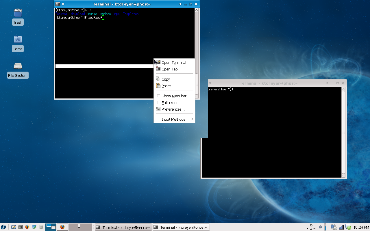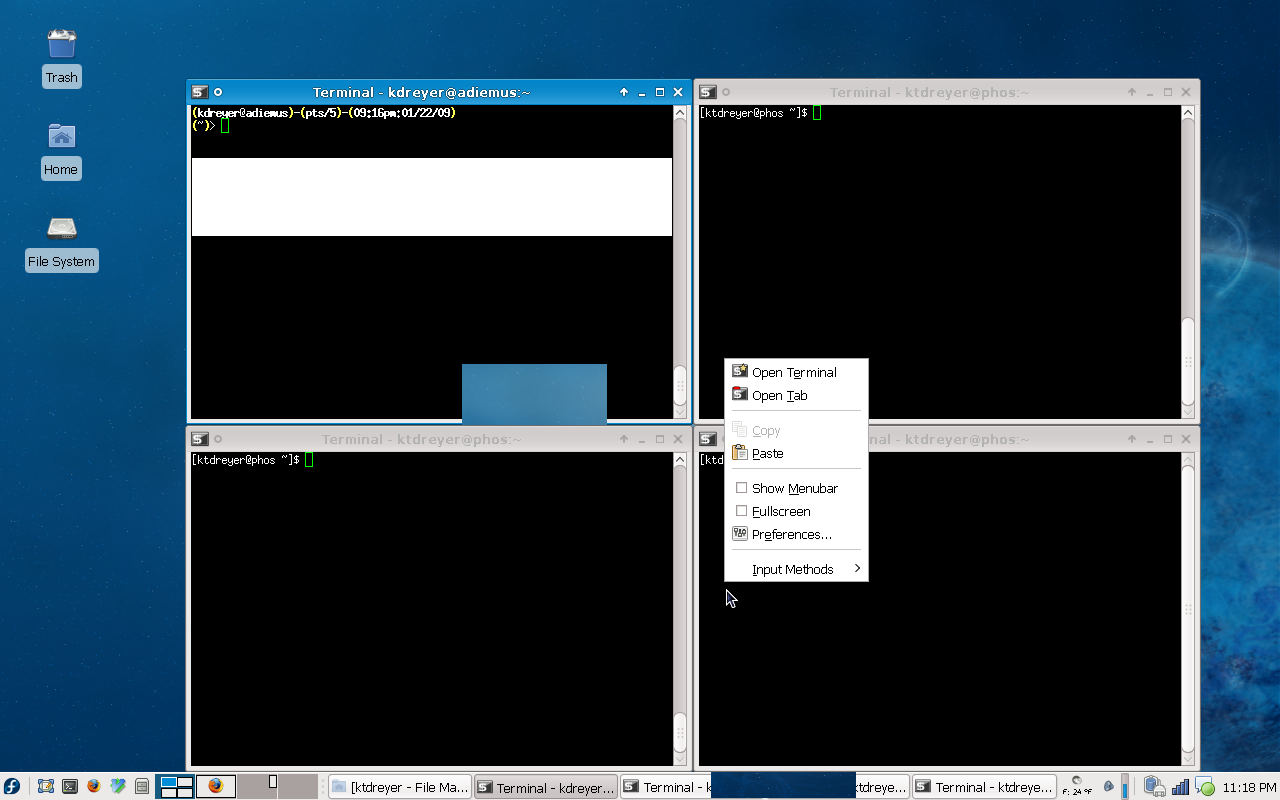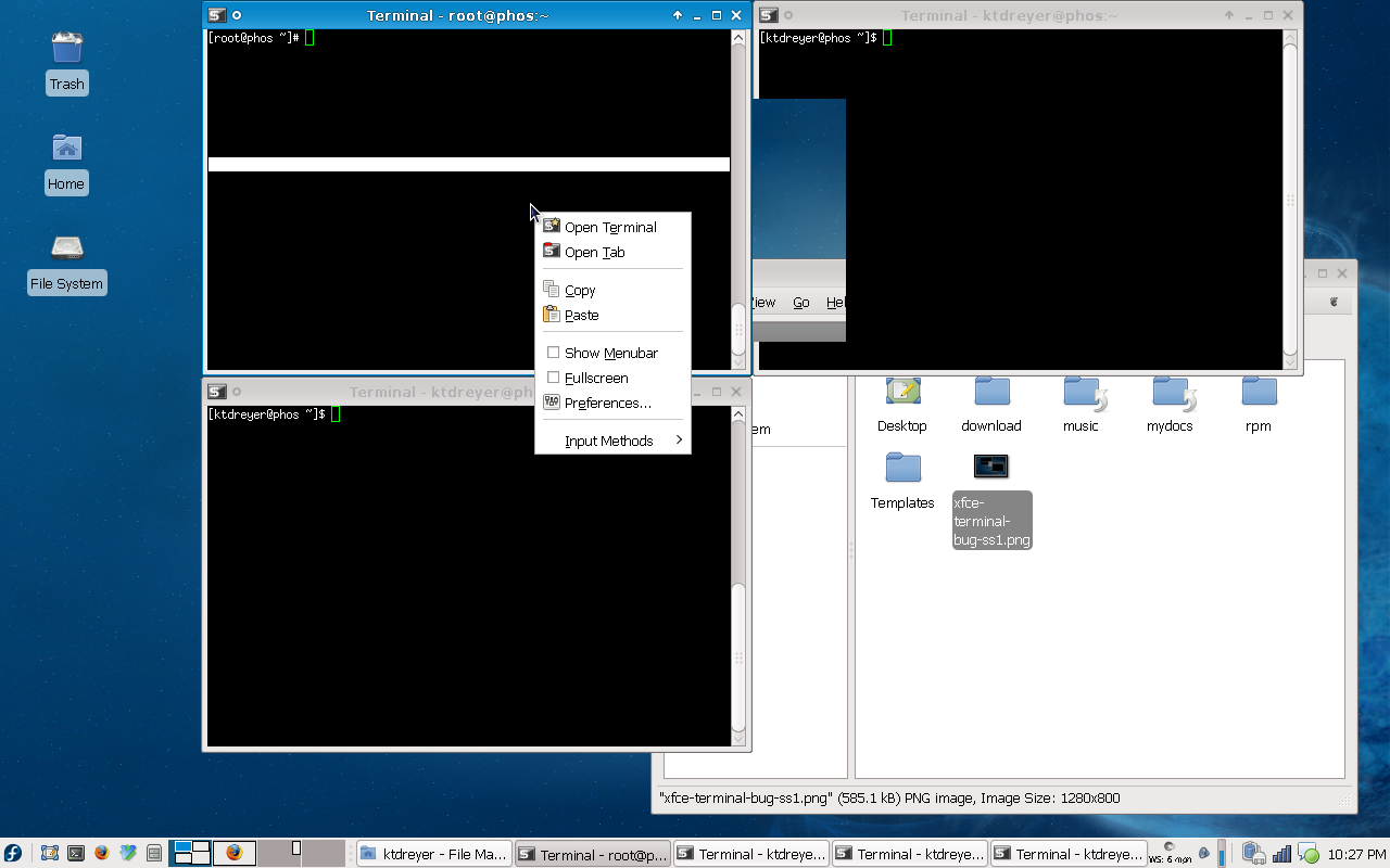Created attachment 2107 a simple example with two terminals I have been experiencing a weird bug with Terminal for the past year or two, and I finally got some screenshots of it. When I right click on a Terminal, sections of other Terminals "disappear". Screenshots are attached. I'm not using composite. Steps to reproduce: 1. Open multiple Terminals and align them next to each other. 2. Select some text in one of the Terminals. 3. Right-click on a Terminal. 4. The context menu will appear, but sections will go "missing" from the other Terminals, loosely resembling the shape and position of the context menu. This does not happen 100% of the time as far as I can tell... perhaps 50%. Maybe there is some weird sequence to trigger the bug that I haven't figured out yet. When I drag the Terminal around, or type "clear", or switch workspaces, or do anything to force the Terminal window to redraw, the missing sections reappear. I don't how to debug this... but if you point me in the right direction I'll try! $ Terminal --version Terminal 0.2.8.3 (Xfce 4.4.3) Copyright (c) 2003-2007 os-cillation e.K. All rights reserved. Written by Benedikt Meurer <benny@xfce.org>. Built with Gtk+-2.14.4, running with Gtk+-2.14.5. $ Xorg -version X.Org X Server 1.5.3 Release Date: 5 November 2008 X Protocol Version 11, Revision 0 Build Operating System: Linux 2.6.18-92.1.18.el5 i686 Current Operating System: Linux phos.ktdreyer.com 2.6.27.9-159.fc10.i686 #1 SMP Tue Dec 16 15:12:04 EST 2008 i686 Build Date: 11 December 2008 05:27:37PM Build ID: xorg-x11-server 1.5.3-6.fc10