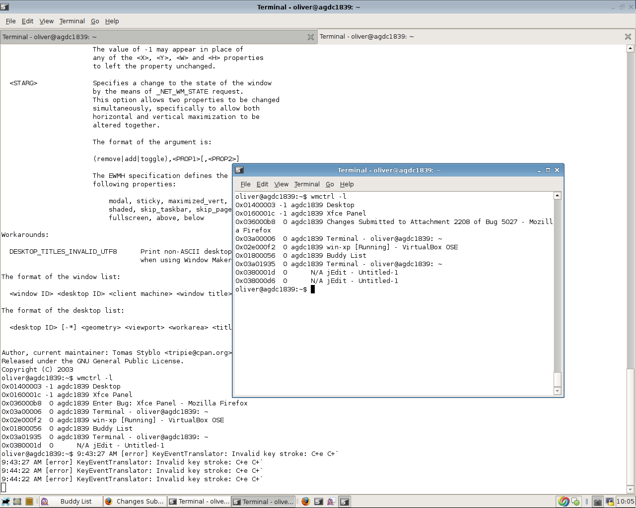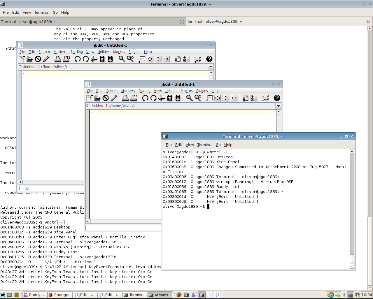 Created attachment 2208 Screenshot after both jEdit windows have disappeared from the Task List Please note the "wmctrl -l" output in the Terminal window